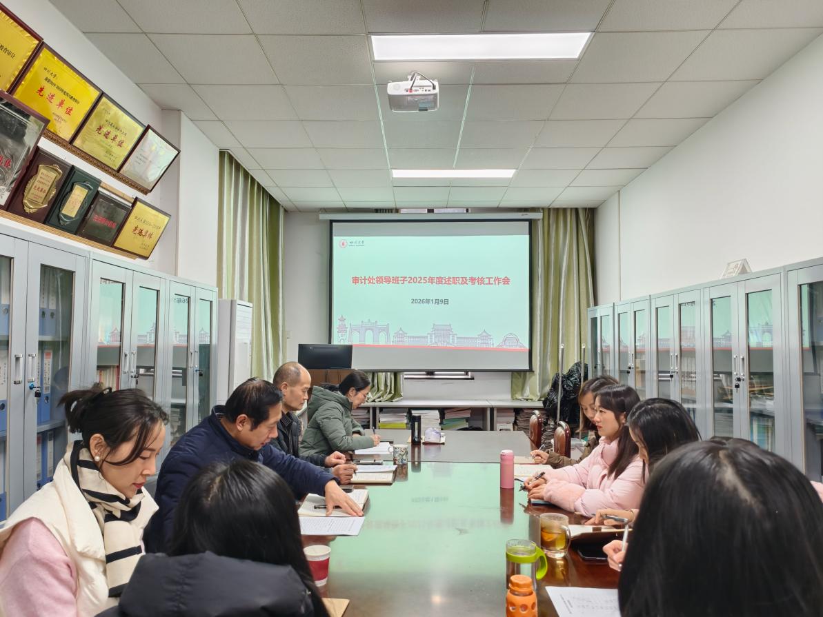 2026年1月9日上午9点,校审计处召开2025年度领导班子述职及考核工作会,校党委组织部相关工作人员及审计处全体人员参加会议,会议由校审计处党支部书记、处长李晓峰主持。